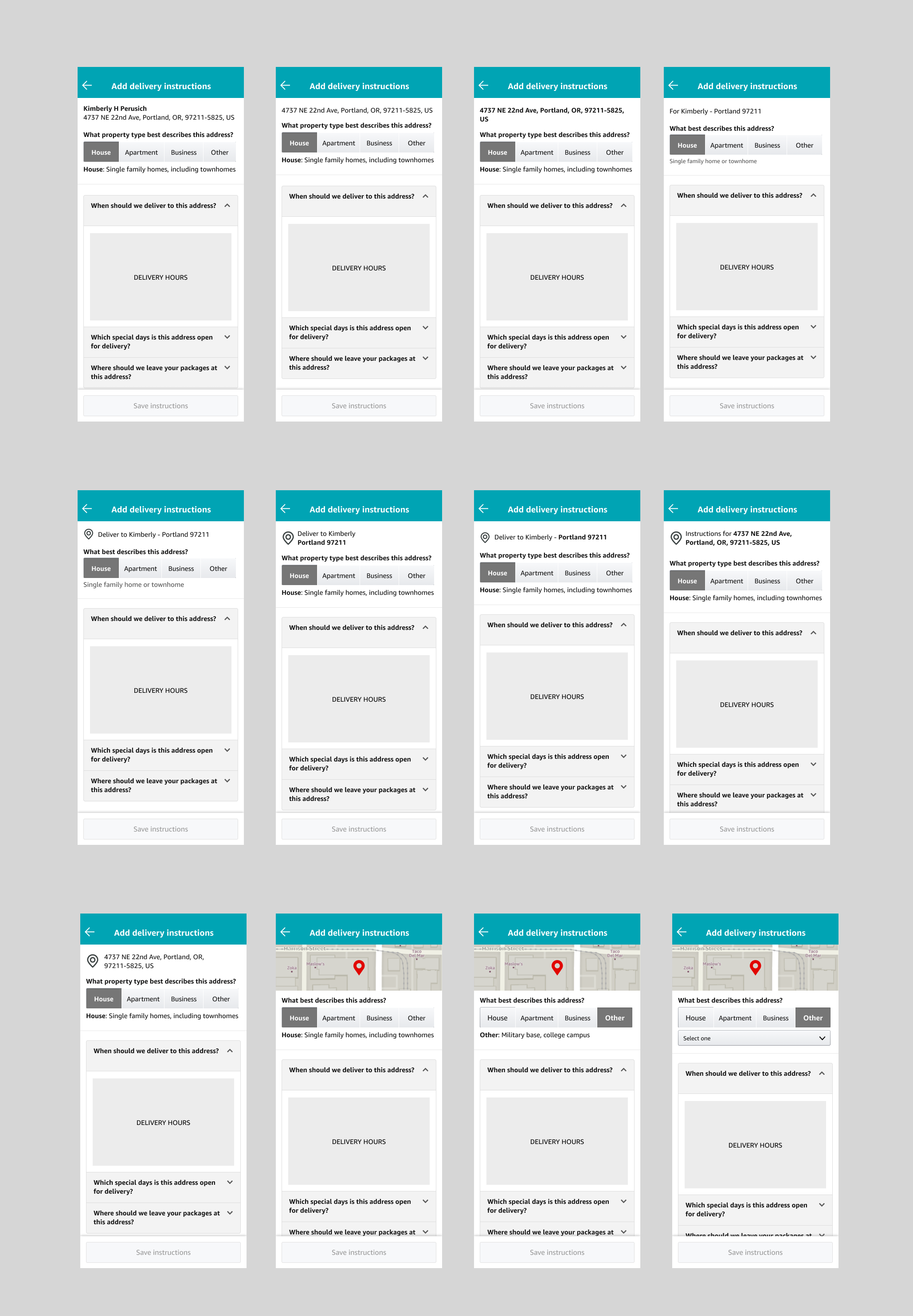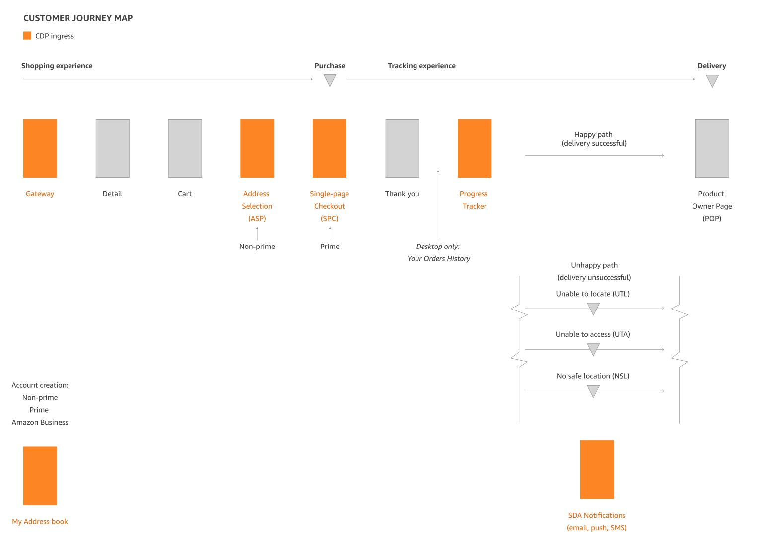 I started by mapping out the customer journey and identifying all existing touch points and workflows across platforms (desktop and mobile) and customer types (Prime, non-prime, and commercial). I wanted to familiarize myself with the experience and in turn discovered several variations in the execution of how we collect address attributes from customers. This helped identify existing problems, visualize the scope of the effort, and provided a starting point for prioritizing the workstreams.